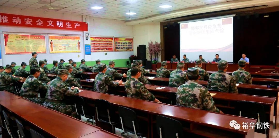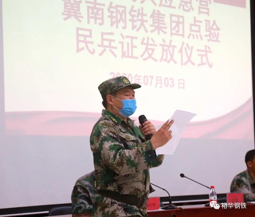 7月3日上午,邯鄲市民兵應急營在冀南鋼鐵集團召開了2020年民兵應急營點驗大會,邯鄲市民兵應急營營長范濤,邯鄲市軍分區政治處領導,邯鄲市民兵訓練基地領導,公司黨委委員、工會副主席孫紅明,安全部副部長李海軍及全體民兵參會。